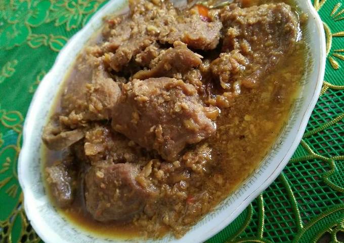 Masak sampai mendidih kemudian masak dengan api kecil selama 20 menit hingga daging empuk dan kuah mengental. Aduk sampai layu lalu masukkan daging sambil diaduk-aduk. 4 sendok makan minyak goreng.